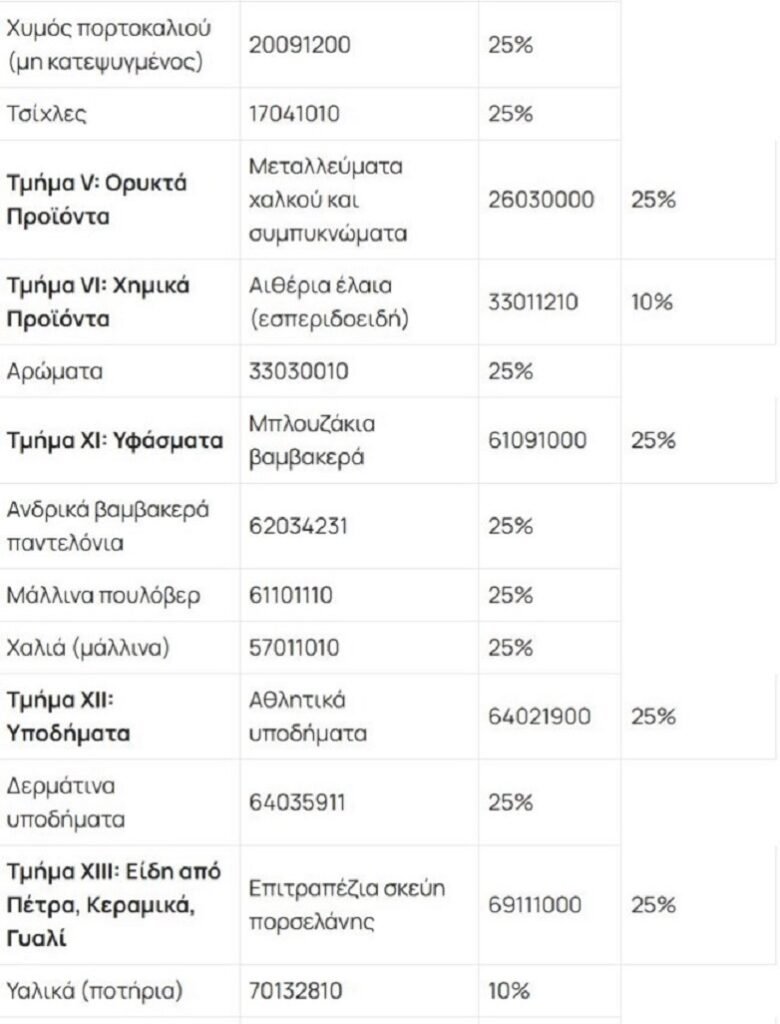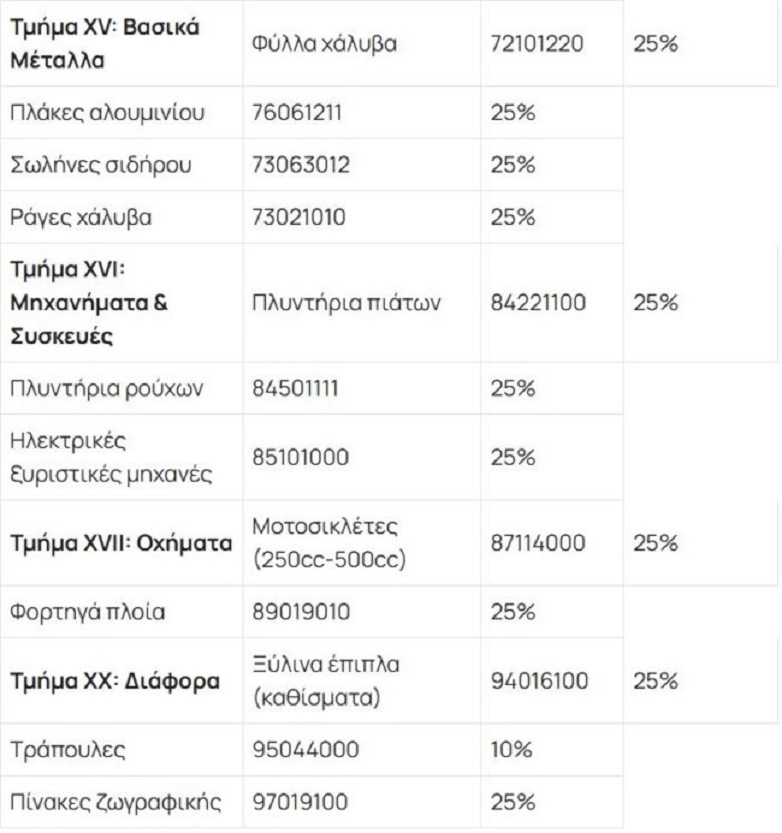 Ευρύ φάσμα προϊόντων (τρόφιμα, υφάσματα, μέταλλα κ.λπ.) έχουν μικτή επιβολή δασμών 10% και 25%. Τα προϊόντα χάλυβα είναι στο 25%. Εκτενής κατάλογος καταναλωτικών αγαθών (τρόφιμα, ένδυση, έπιπλα) τα εντάσσει στο 25%. Αμύγδαλα και σόγια ταξινομούνται στο 25%.