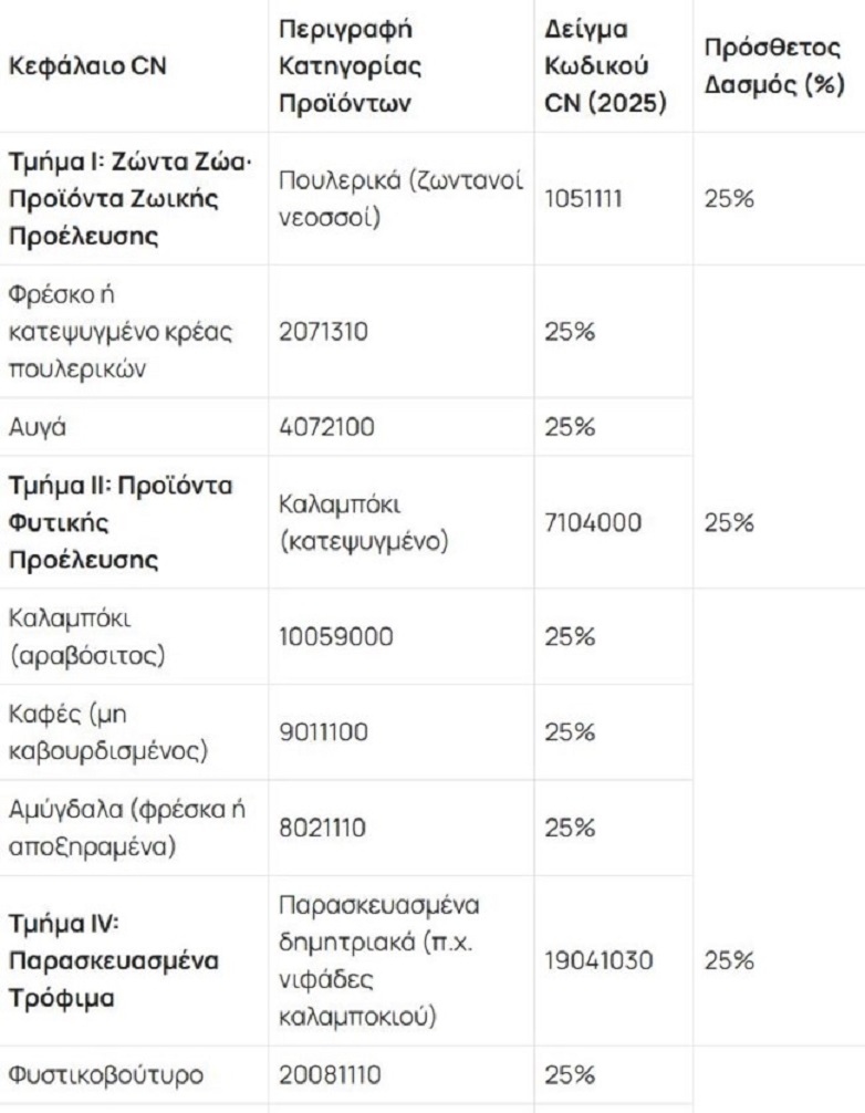 Ο δασμός 25% κυριαρχεί, υποδεικνύοντας ισχυρή στάση ανταπόδοσης, ενώ οι δασμοί 10% σε επιλεγμένα είδη (π.χ. καλλυντικά, μπαταρίες) δείχνουν μια πιο μετριοπαθή προσέγγιση για αποφυγή υπερβολικής κλιμάκωσης.