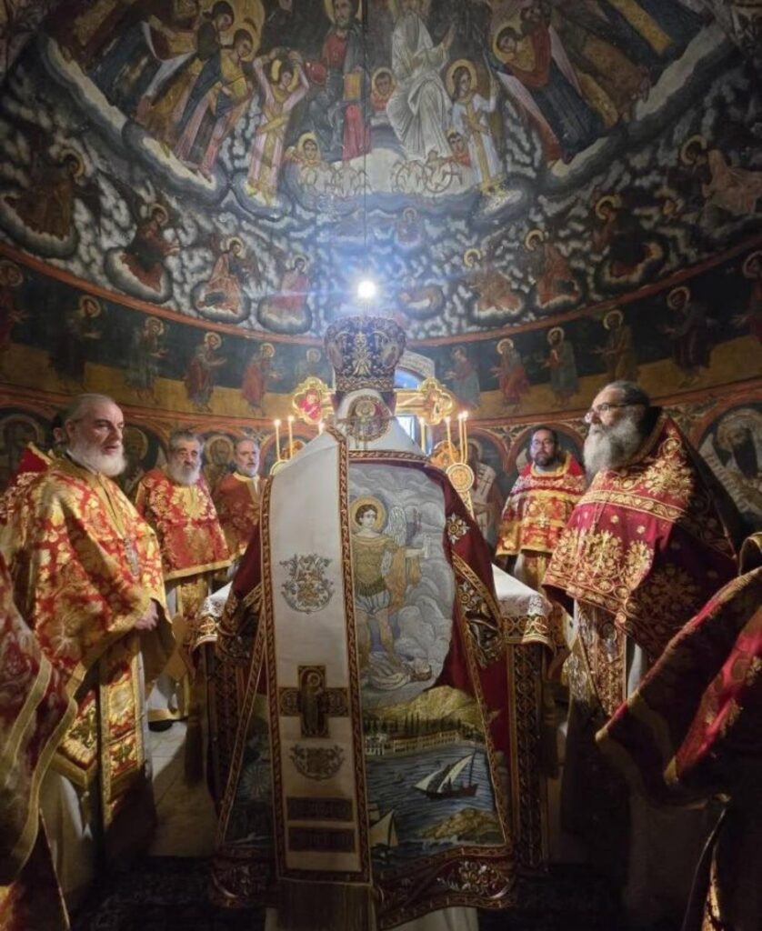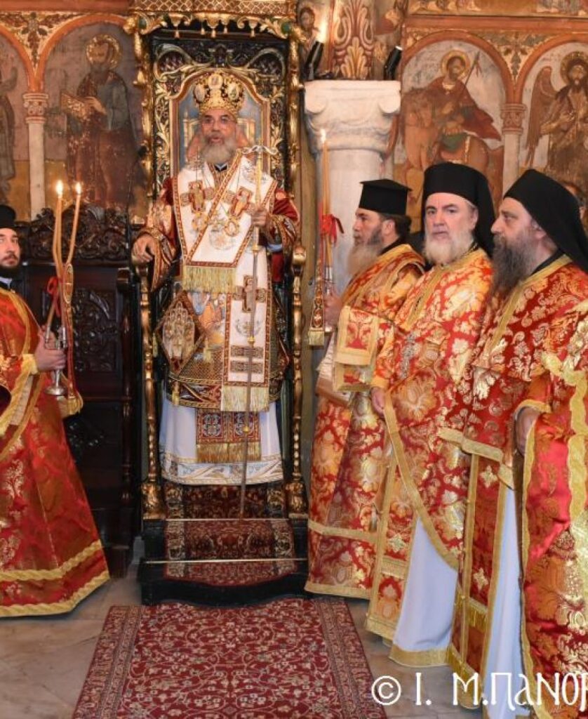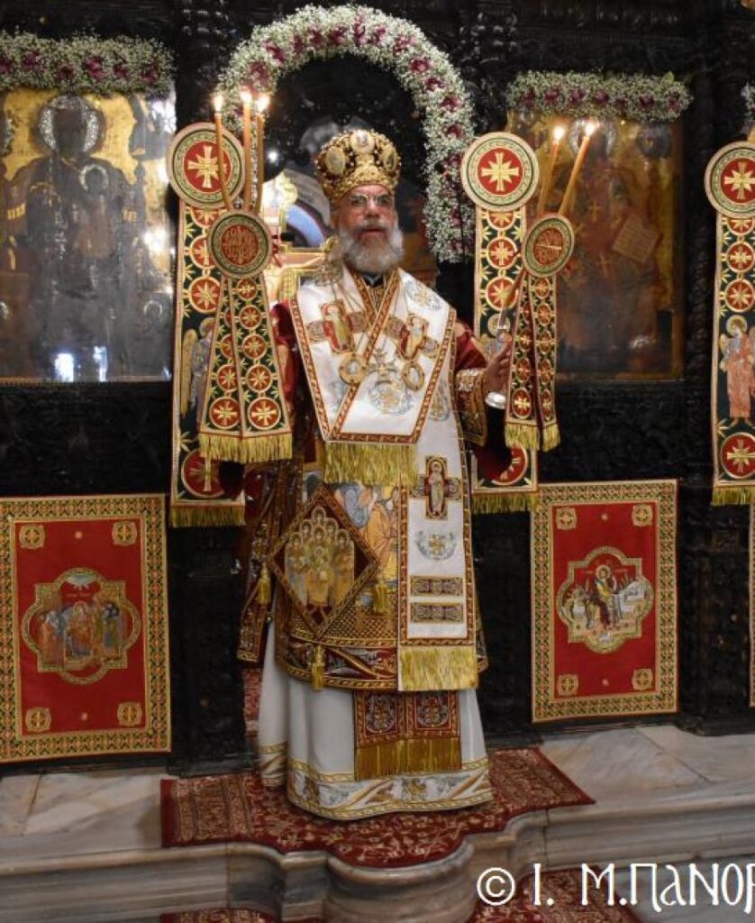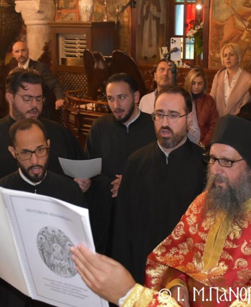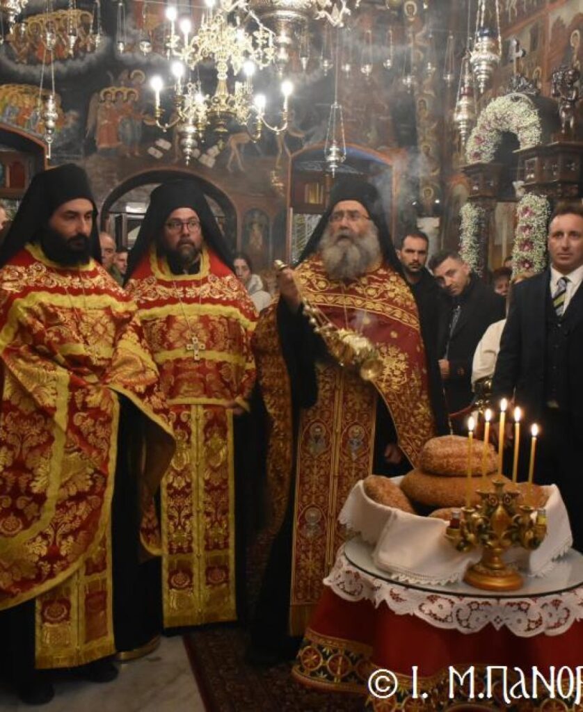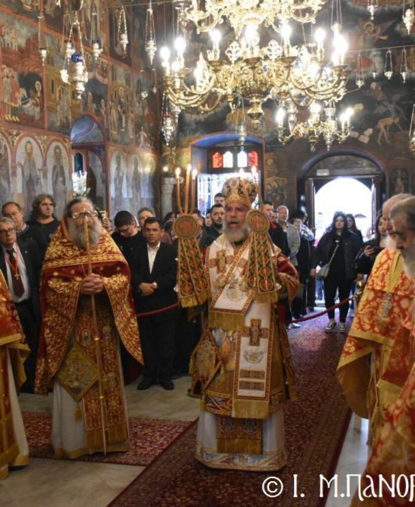 Σήμερα τό πρωΐ, Σάββατο 8η Νοεμβρίου, κυριώνυμος ἡμέρα τῆς Πανηγύρεως, ὁ Σεβ. Ποιμενάρχης μας κ. Χρυσόστομος, χοροστάτησε στόν Ὄρθρο καί προεξάρχων τῆς Εὐχαριστιακῆς Συνάξεως, τέλεσε τήν Θεία Λειτουργία μετά τῶν ὡς ἄνω κληρικῶν, ἐνῶ τά Ἀναλόγια καθ’ ὅλας τάς Ἱ. Ἀκολουθίας διηκόνησε γλυκυφθόγγως πολυμελής Βυζαντινή Χορωδία ὑπό τήν διεύθυνση τοῦ Χοράρχου καί Πρωτοψάλτου κ. Γεωργίου Ρισάνου ἐξ Ἀθηνῶν.