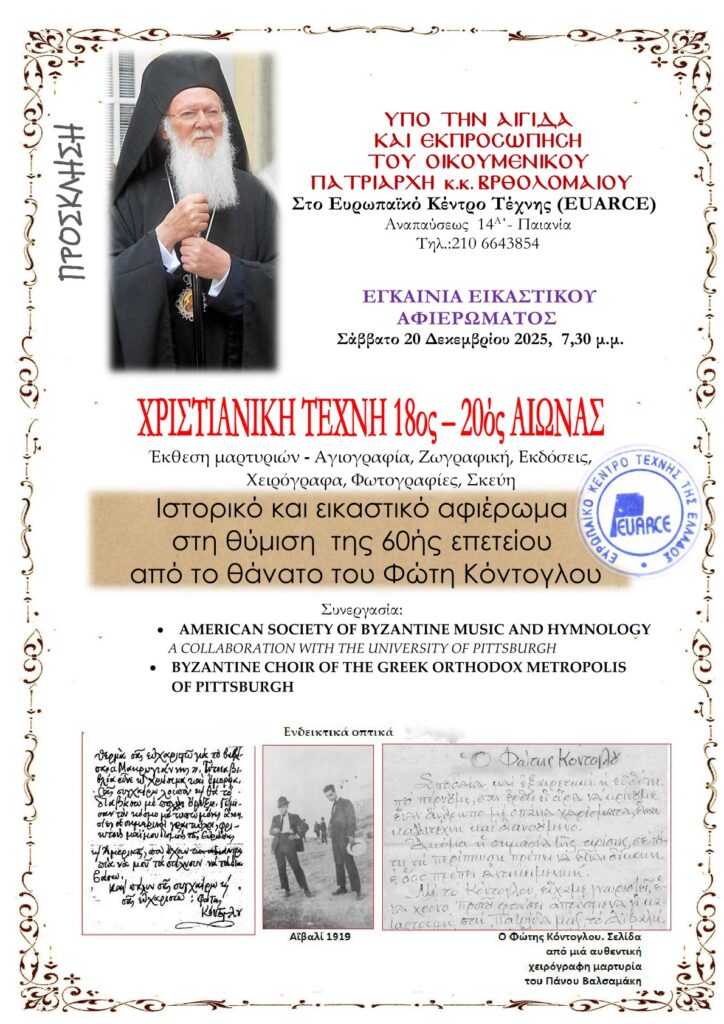 (Αναπαύσεως 14Α΄- Παιανία Τηλ.: 210 6643854) στα εγκαίνια του Iστορικού και εικαστικού αφιερώματος στη θύμηση της 60ής επετείου από το θάνατο του Φώτη Κόντογλου με Έκθεση Αγιογραφίας, Ζωγραφικής, Εκδόσεων, Χειρογράφων, Φωτογραφιών και Σκευών – ιστορικών ντοκουμέντων από τον 18ο μέχρι και τον 20ό αιώνα